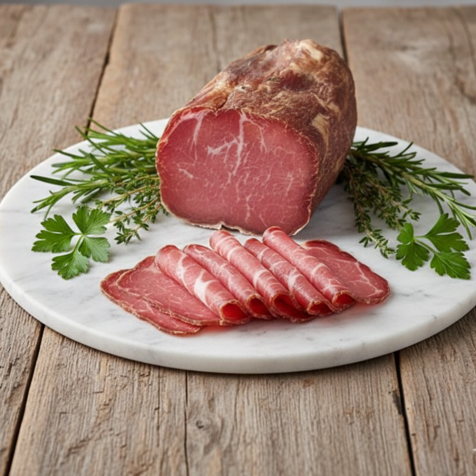 Der Schinken von unseren regionalen Schweinen wird in unserer Manufaktur mit feinsten Biogewürzen eingelegt. Anschließend wird der Fränkische Lomo in natürlichem Buchenrauch geräuchert. Wir geben diesem Schinken im Reiferaum Zeit, um sein Aroma zu entfalten. Der weiße Edelschimmel, der sich vereinzelt auf der Oberfläche bildet, verleiht den einzigartigen Geschmack! Hauchzart geschnitten, Scheibe für Scheibe ein Hochgenuß! Da der Lomo aus dem Schweinerücken geschnitten wird, ist er besonders mager aber trotzdem wahnsinnig lecker